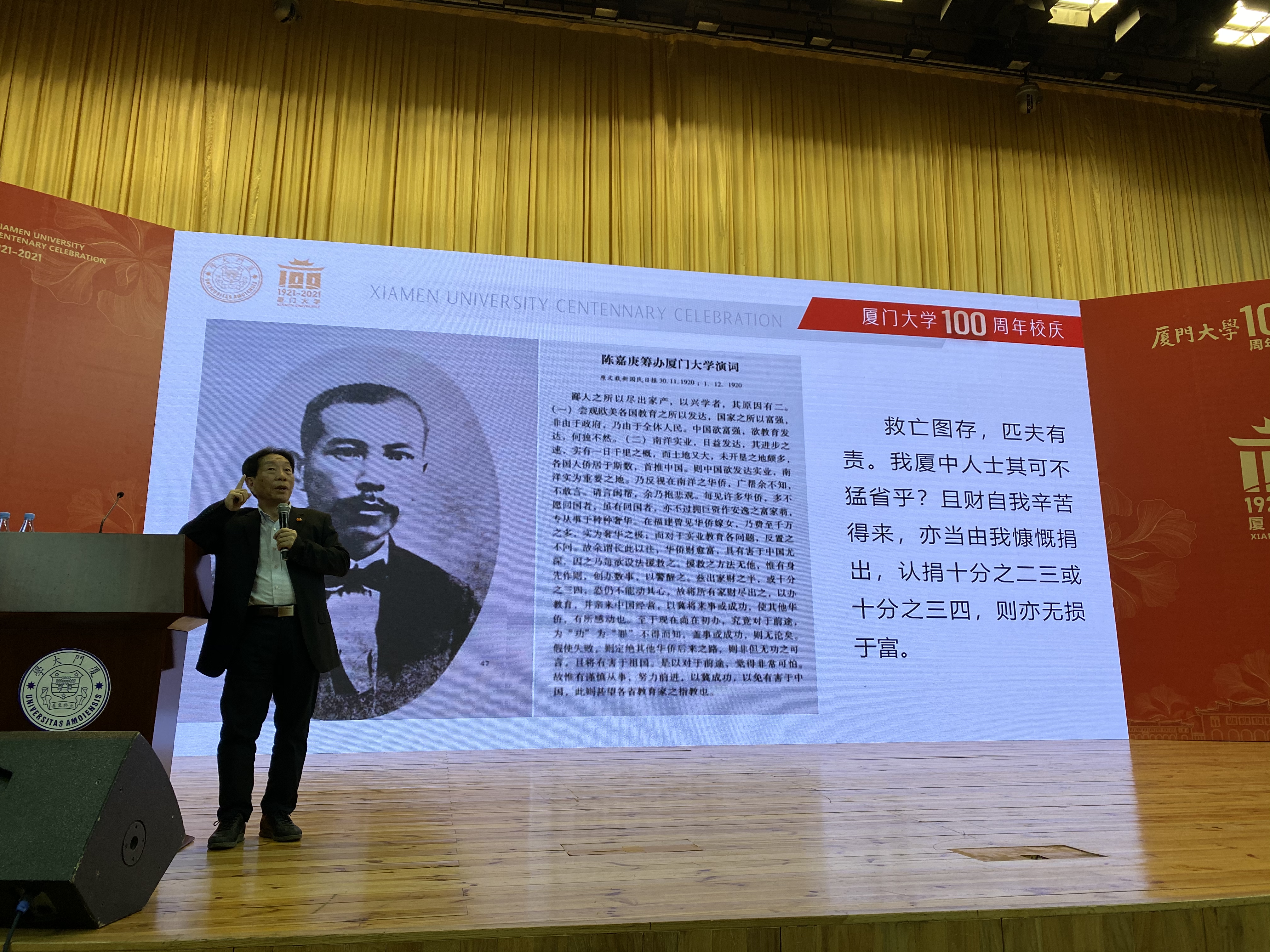 誓师大会后,人文学院教授朱水涌应邀作《教育救国宏文——陈嘉庚< 筹办厦门大学演讲词>解读》主题报告,为全体志愿者上了一堂生动的“嘉庚精神 薪火相传”主题团课。他动情讲述厦大奠基石与陈嘉庚《筹办厦门大学演讲词》背后的故事,勉励同学们充分利用百年校庆契机,读原著、学原文,进一步深入学习传承嘉庚精神,厚植爱国情怀,知史爱校、学史力行,淬炼本领才干,勇于担当作为,努力为中华民族伟大复兴的中国梦贡献青春力量。