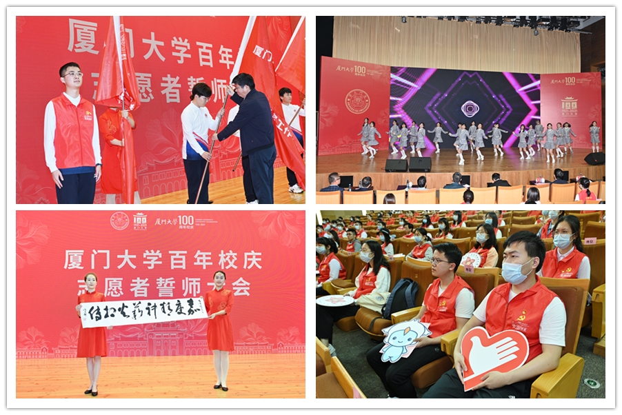 志愿者代表、志愿者中心党支部的党员代表刘明辉,志愿者小组联络人、校团委秘书王心君,离退休志愿者代表、厦大书画研究会副会长吴世辉依次发言,分享对志愿服务工作的体会,表达对做好百年校庆志愿服务工作的决心。据悉,自去年起,来自全校各学院近万名同学踊跃报名,最终选拔出3759人成为百年校庆青年志愿者。学校为每一位志愿者精心制作了百年校庆志愿者录取通知书,每一份通知书由10余位离退休老同志们利用一整天时间书写,一笔一划倾注着他们对志愿者们的关怀和对百年厦大的热爱。