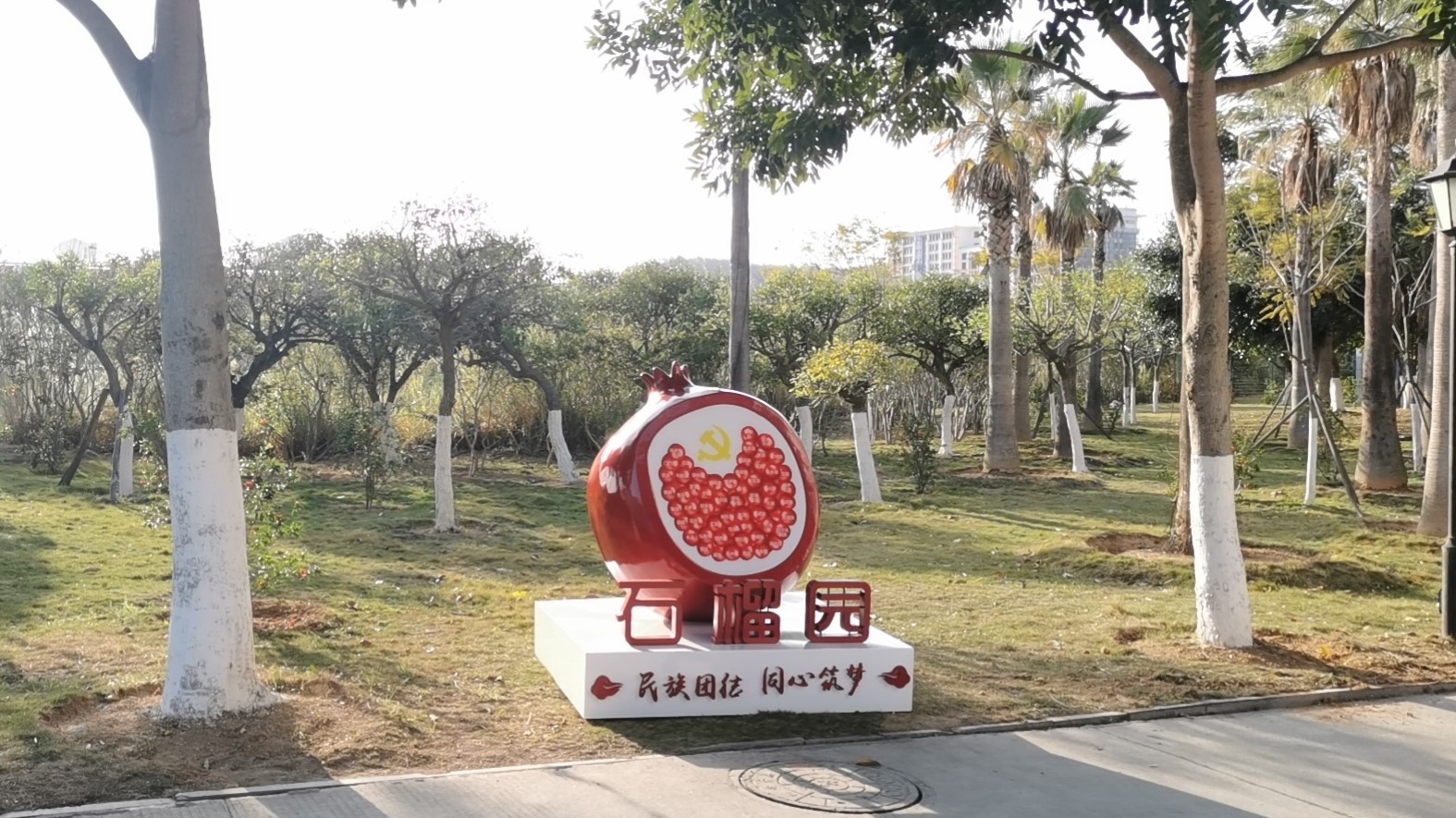 3月下旬,“民族团结石榴园”主题雕塑安装完毕。石榴园主题雕塑由基座和主体部分组成。白色的基座上镶嵌着“民族团结,同心筑梦”八个大字。主体部分的一侧为石榴果造型;另一侧为56颗标注着我国56个民族的石榴籽,围绕着中国共产党党徽,寓意我国56个民族紧紧团结在党的周围,拥护党的领导,听党话,跟党走,牢固树立中华民族共同体意识。