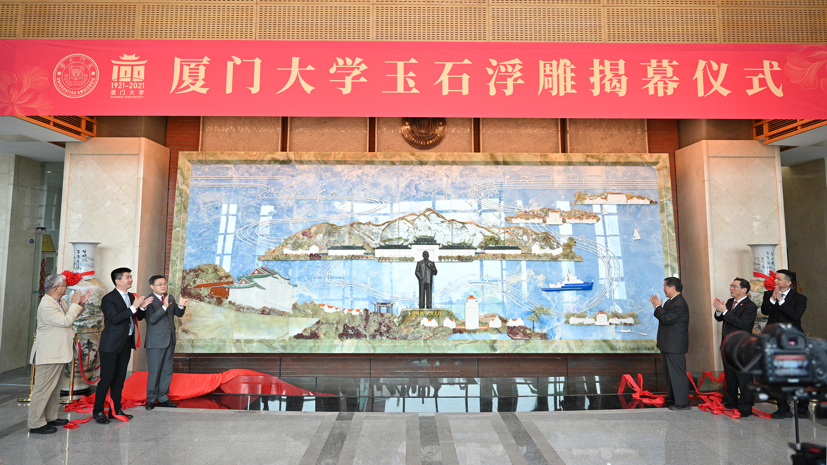 4月3日上午,厦门大学玉石浮雕在科学艺术中心二楼大厅揭幕。校长张荣,厦门市原副市长潘世建、原市政协副主席魏刚,厦门凌云玉石有限公司董事谢友权,校党委常务副书记李建发,武汉理工大学闽南校友会会长黄福龙,我校原常务副校长潘世墨出席。揭幕仪式由校党委副书记、纪委书记全海主持。
