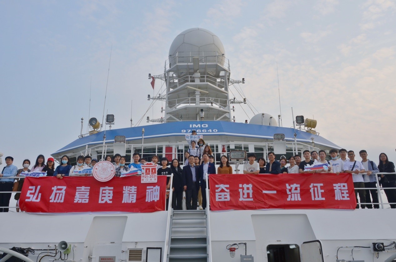 此次讲坛恰逢厦门大学百年校庆。科考船上悬挂着“弘扬嘉庚精神、奋进一流征程”的校庆主题横幅。讲座结束后,现场的师生们登上甲板,手举着校徽、百年校庆标识等图板,共同祝福母校在新百年乘风破浪、再铸辉煌!