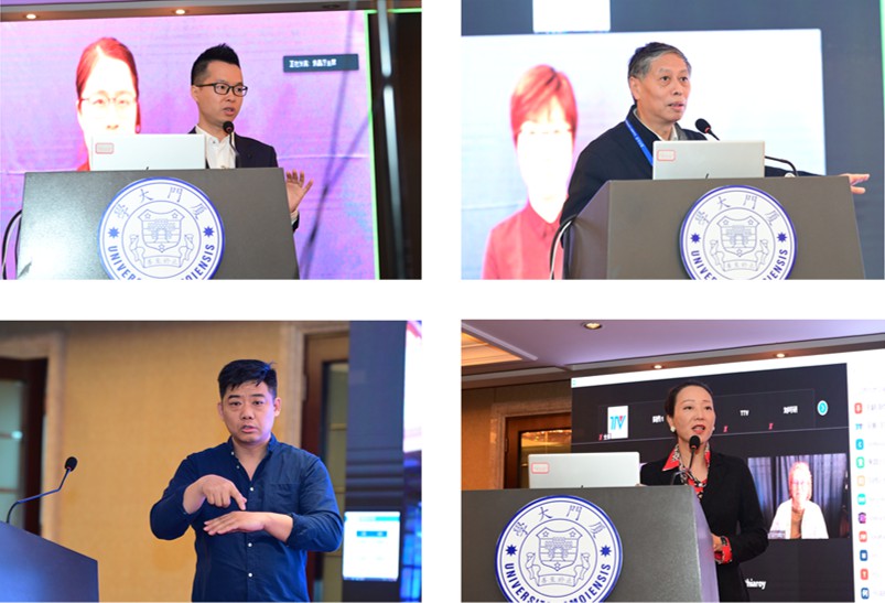 厦门大学校长助理方颖,中国翻译协会常务副会长黄友义先生,浙江大学副校长何莲珍教授,中国外文局机关党委常务副书记闵艺女士,中国翻译协会常务副会长兼口译委员会主任仲伟合教授,教育部高等学校特殊教育教师培养教学指导委员会主任、北京师范大学顾定倩教授,世界翻译教育联盟理事长、澳门大学人文学院副院长李德凤,厦门大学外文学院优秀院友代表、商务部欧洲司余元堂先生,华为技术有限公司翻译部部长江燕飞先生,厦门大学口译学科创始人林郁如教授,厦门大学外文学院党委书记陈志伟女士,院长陈菁教授出席了此次论坛。国际大学翻译学院联合会主席(CIUTI)Maurizio Viezzi教授、国际口笔译核心期刊ITT主编Elsa Huertas Barros教授线上参与了主论坛。
